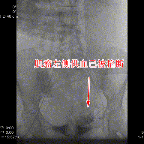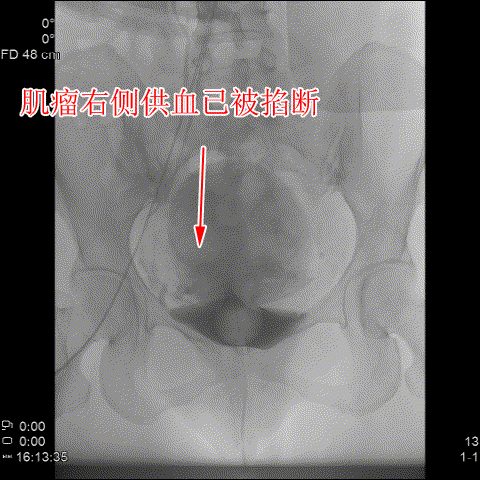 △術後造影可見肌瘤左右側的供血已被掐斷。